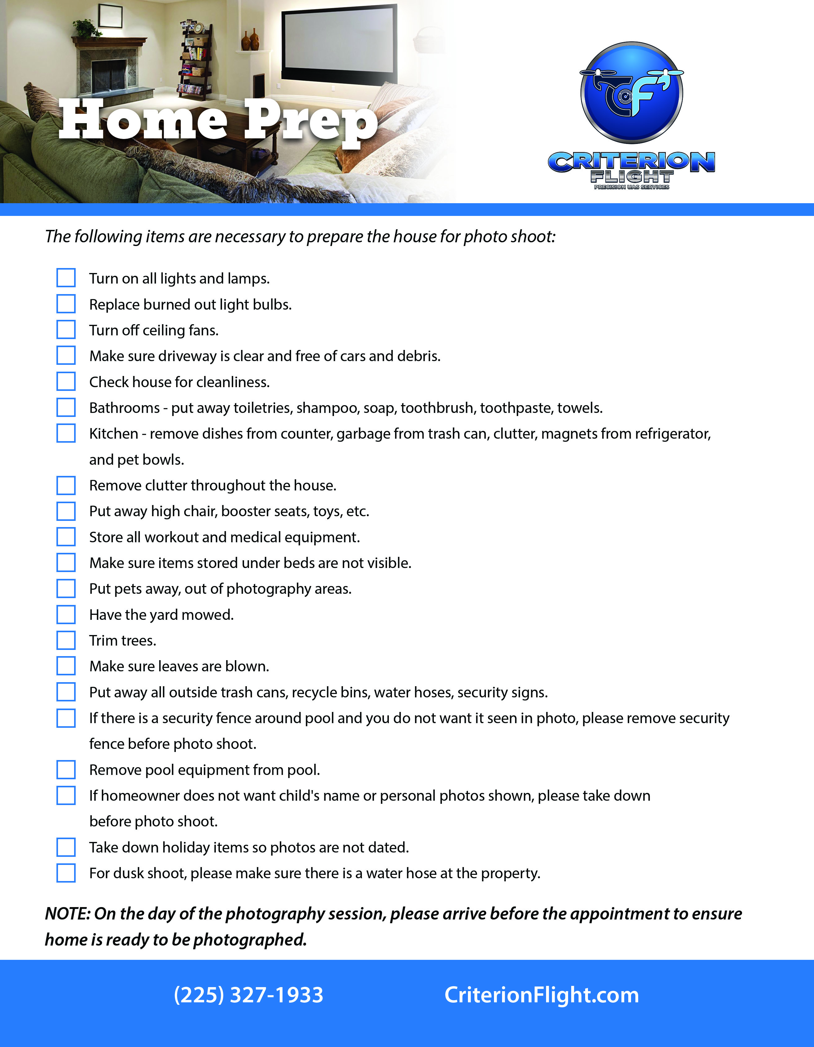 After setting an appointment with Criterion Flight, please review the home preparation flyer to ensure your property is ready for the photo shoot. Here you will see all those requirements for photography